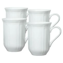 This uniquely-shaped all-white design adds a touch of elegance to a traditional setting. It coordinates perfectly with both formal and casual stemware and flatware as well as our own Antique Orchard pattern. There is a complete suite of accessories to create a classically stylish casual dining statement. This high quality porcelain pattern is dishwasher safe, microwave safe and chip resistant. The set contains 4 mugs, each measures 4-1/2 inch high x 4-3/4 inch wide (with handle) and holds 14 ounces.