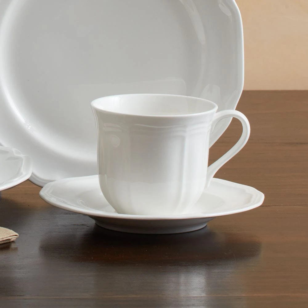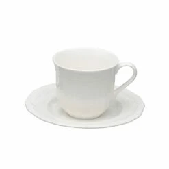 This Mikasa Antique White Tea Cup and Saucer Set features a uniquely-shaped all-white design that will add a touch of elegance to a traditional setting.