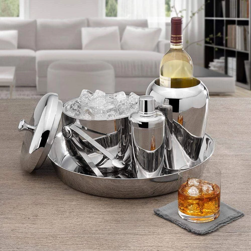 Mikasa Apple barware adds modern style to any gathering. Crafted of stainless steel with a beautiful shiny polished finish. Dishwasher safe. 5 Piece Bar Set includes (1) each: Cocktail Shaker, Ice Bucket with Lid, Ice Tongs, Wine Bottle Chiller and Bar Tray. Shaker, Ice Bucket and Wine Chiller measure 8 inch high, Bar Tray measures 15-3/4 inch diameter x 2-1/4 inch high.
