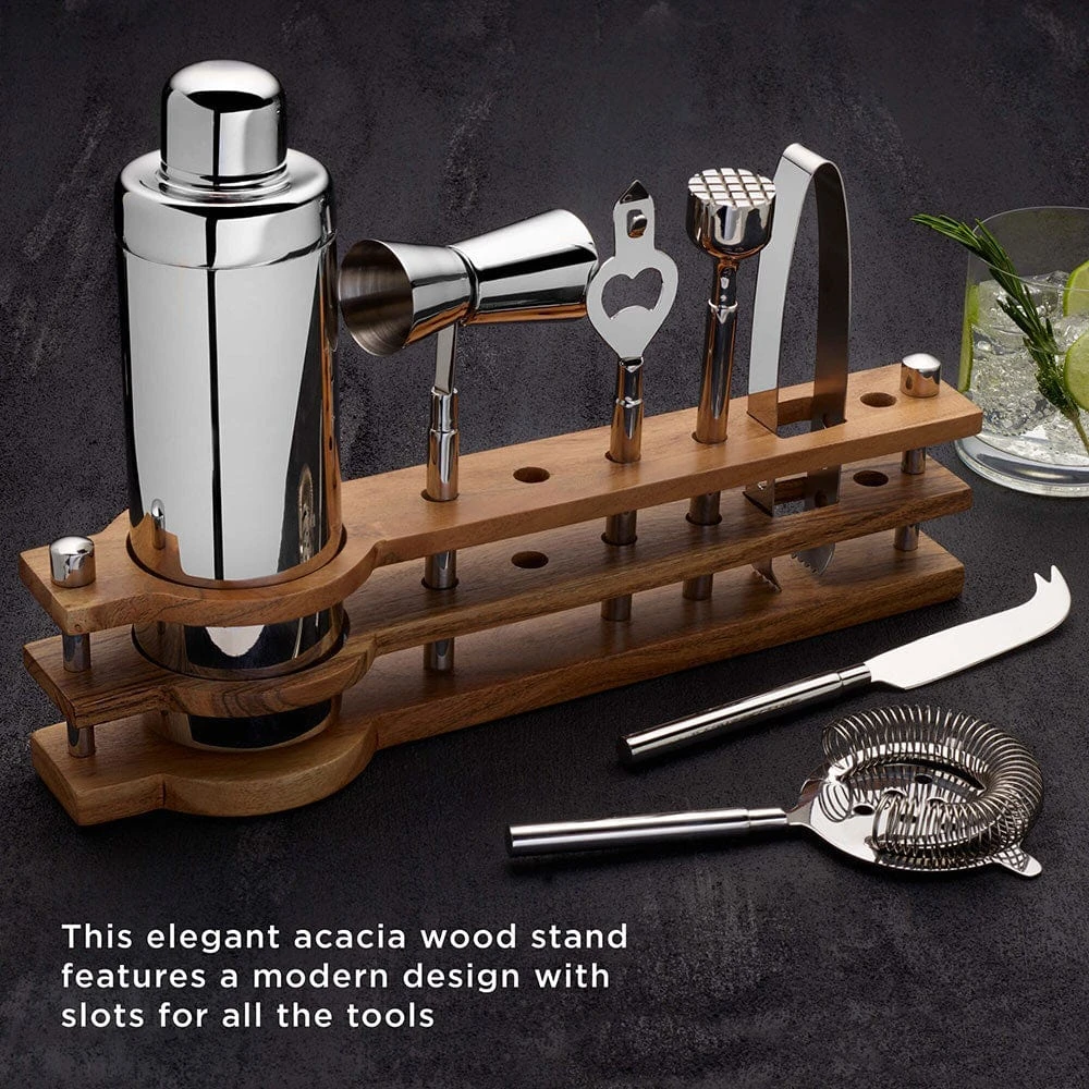 • 8 Piece Set includes (1) each of: Shaker, Cap Lifter, Bar Knife, Strainer, Muddler, Double Jigger, Ice Tongs, all kept neat and tidy in the included wood stand