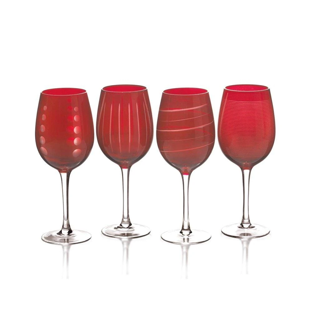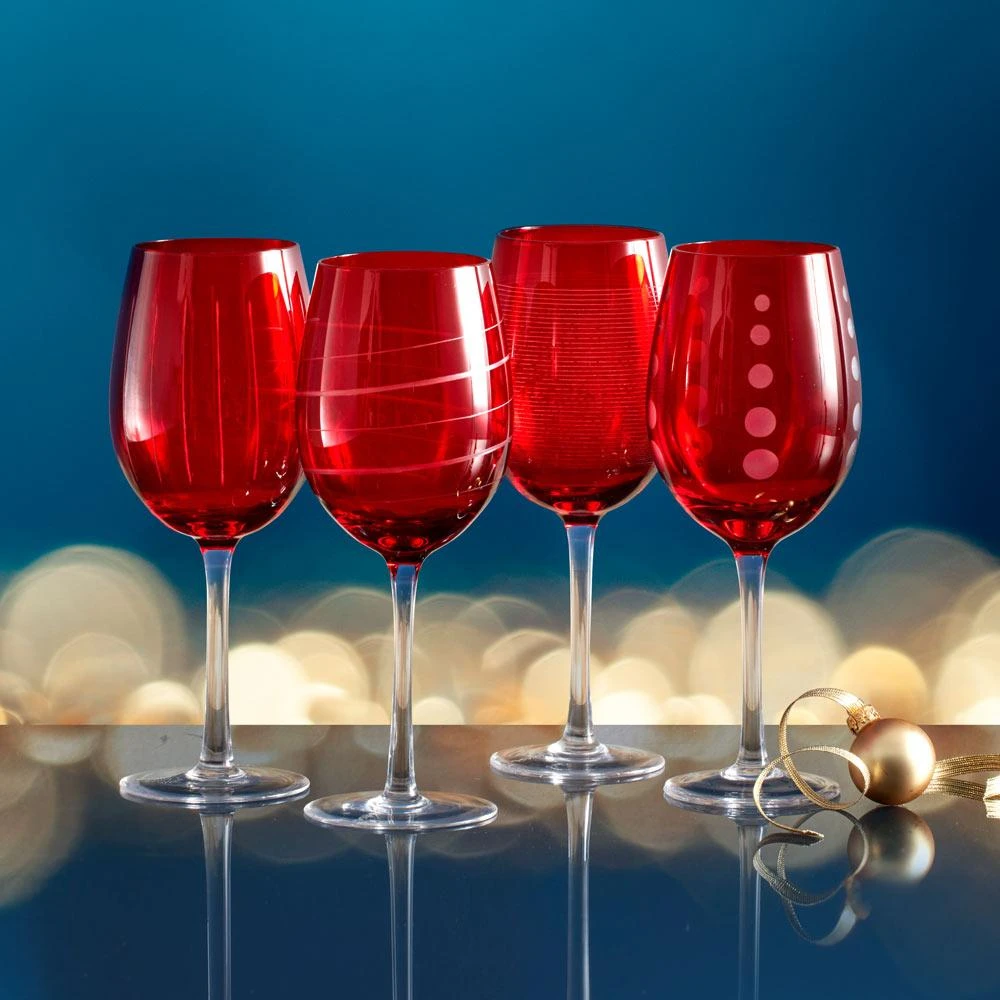 The fun and whimsical designs of the Cheers collection set a festive mood at any gathering, and the vibrant ruby coloring kicks the merry mood up a notch. Each glass in the set of 4 is precision-etched with a different yet coordinating design. The dots, lines, and swirls are also distinctive, so each of your guests can easily identify their glass without the need for wine charms. Hand wash recommended. Set of 4 wine glasses, each holds 16 ounces.
