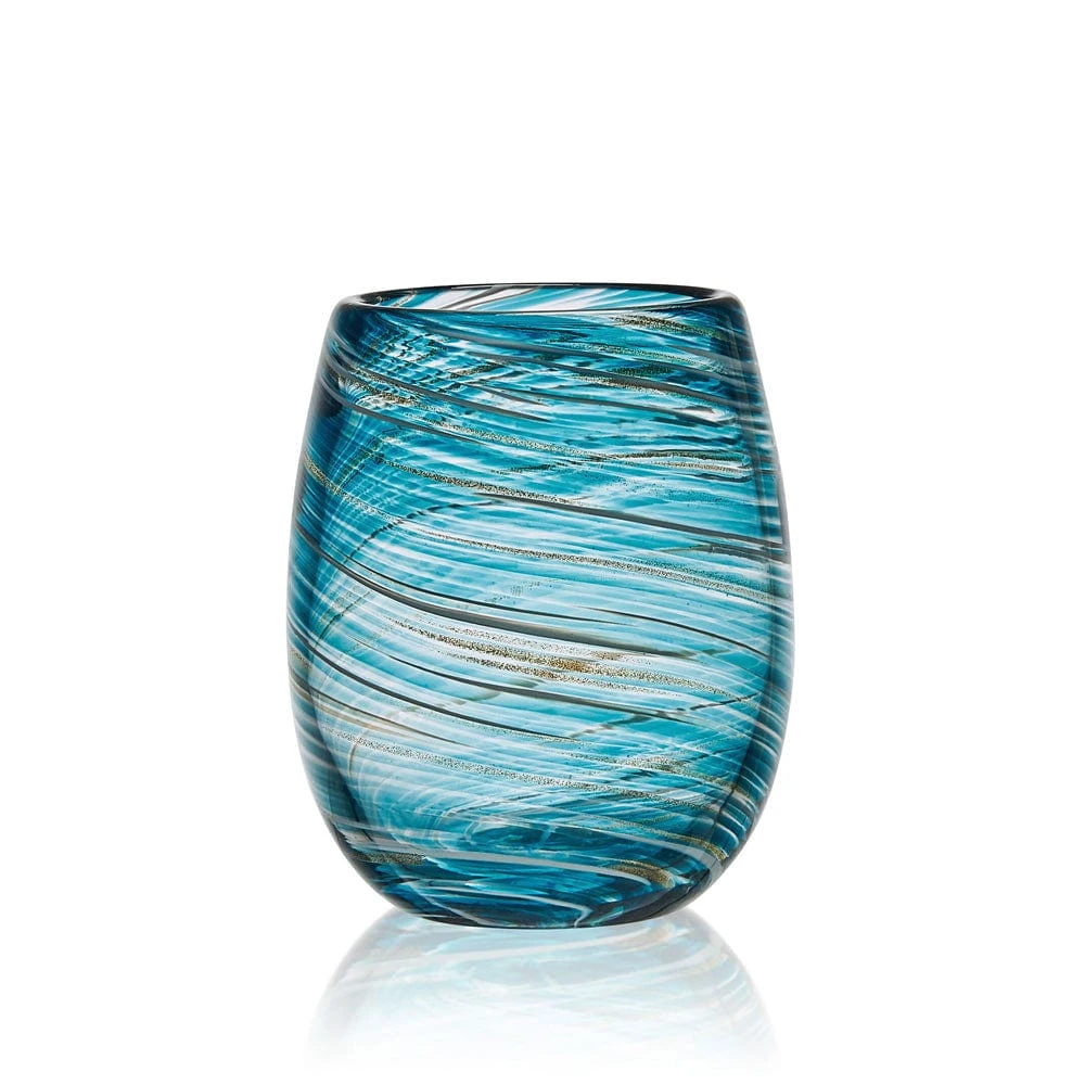 The Color Swirl Stemless Wine Glasses are uniquely handcrafted and feature contemporary curves, bold silhouettes, and distinct delicate bubble accents, in vibrant shades of blue swirling around the body, highlighted by metallic gold flecks that sparkle in the light, bringing modern allure to your parties and dinner gatherings.