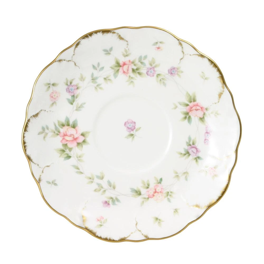 Brought back by popular demand! Endearment gives a classic floral pattern a touch of contemporary flair while retaining the traditional elements that make the style so enduring. A garland of delicate flowers in a soft palette frame a single center flower, and the scalloped shapes of each piece in this dinnerware collection are accented by gentle gold highlights. Constructed of Bone China. Hand wash only. The saucer protects your table from a teaspoon, as well as hold those tasty treats you like to enjoy with your coffee or tea. Saucer measures 5-3/4 inch diameter.