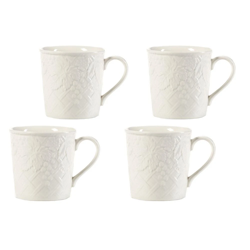 The essence of nature is transformed into a sophisticated setting with the simplicity and style of this charming all-white embossed fruit design. Whether formal and casual, English Countryside adds a touch of class to your dining pleasure. One of our best selling patterns, there is a full array of accessories for a beautiful and complete casual dining statement. Crafted from superior quality stoneware, this pattern is dishwasher safe, oven safe, freezer safe and microwave safe. The set includes four 11-1/2 ounce mugs.