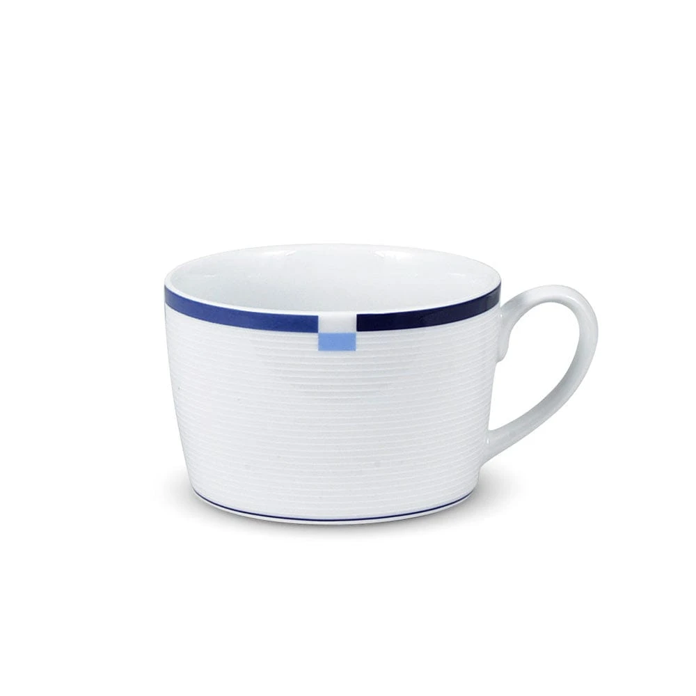 This Jet Set Blue Set of Tea Cups and Saucers feature a simple white center that is outlined with a thin blue border, and the outer rim will capture the eye with a subtle ridged element framed by a thicker band of alternating blue tones. These are broken into four quadrants by unique tab accents, transforming your tabletop into a canvas of modern design and color.