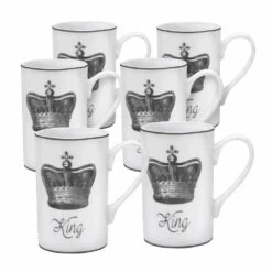 This Set of 6 King Crown Mugs feature a white background glaze, with a platinum design of a royal Crown and the word “King” underneath the crown. The unique design will add a whimsical touch to your everyday dining.